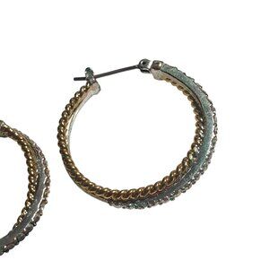 Mixed metal hoop earrings feature textured gold and silver tones. Ideal for vintage enthusiasts. Lightweight, classic design adds a subtle statement. Good pre-owned condition shown in photos.