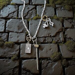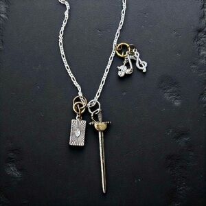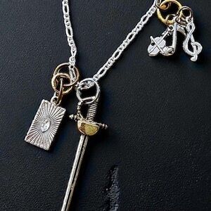 Gold Silver and Bronze Toned Bardic DND Rapier Sword Pendant Necklace with charms to represent bards in dungeons and dragons. A Rapier Violin Music Notes and a charm representing tarot cards or a deck of cards. Fun and a great gift. For a player or DM. Unisex. Adjustable from 15.5”-17” Size see picture with US quarter.