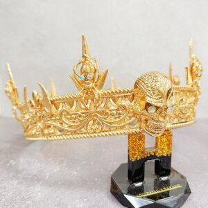 The Gold Skull Crown is a handmade XL-sized headpiece made of gold, crystal, and rhinestone materials. This crown, designed in a skull theme, is perfect for various occasions such as weddings, birthdays, parties, proms, pageants, and cosplay. Made in the United States, this crown of the damned is a stylish and eye-catching accessory for those looking to make a statement with their outfit.