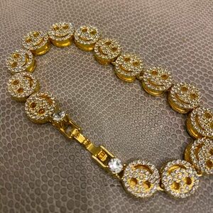 Elegant gold bracelet featuring smiley face charms adorned with sparkling rhinestones. Perfect for adding a touch of fun and glamour to any outfit.