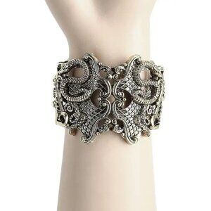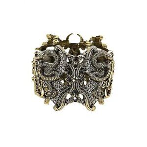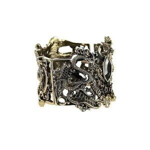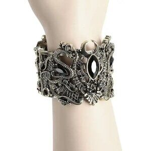 This wide bangle features two entwined snakes, crowned w/ an oval gemstone, framed by Lucifer horns, crescent moons, & a pentagram set w/ black stones.