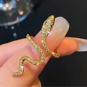 Elegant gold snake ring with a shimmering finish. Perfect for adding a touch of luxury to any outfit.