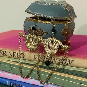 Please note: the left earring is missing one black bead from the upper snake detail. This flaw doesn’t impact wearability and actually lends itself to the current trend of asymmetrical earrings. No other flaws present.