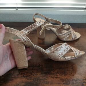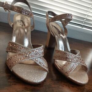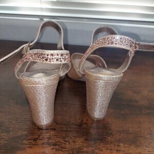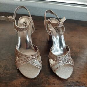 These are gorgeous glittery heels by Valenti Franco in size 8. Heels are about 3.5 inches. Adjustable ankle strap. They've been very lightly used, probably only worn once or twice. Perfect condition other than normal wear on the bottoms. They're sort of gold / champagne colored.