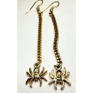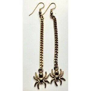 Statement gold-tone spider drop dangle earrings measure 3.5 inches long, perfect for witchy goth or dark boho aesthetics with spooky Halloween vibe. Unmarked costume jewelry offers lightweight, dramatic swing for festivals, parties, or everyday edgepairs with black lace, velvet, or layered looks. Assumed good vintage condition; bold arachnid design appeals to alternative fashion lovers seeking unique, affordable statement pieces.