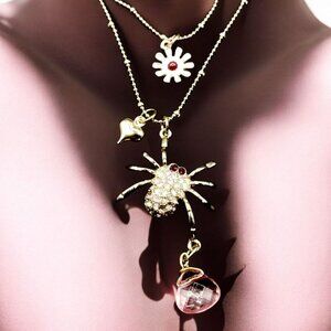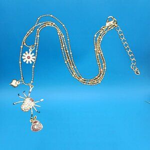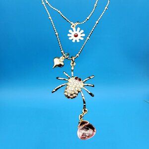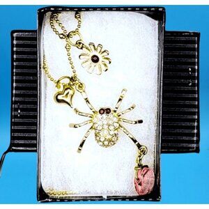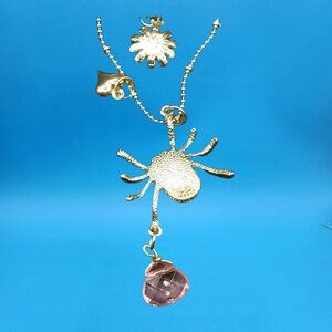 Gold Spider Pendant Necklace w/ Pink Crystal Heart & Flower Charms Gothic Boxed