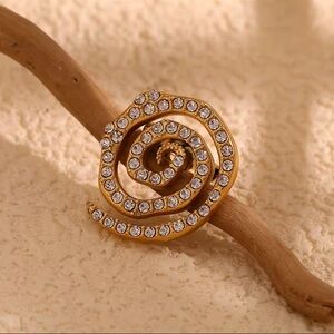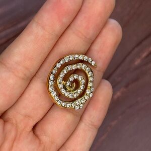 This stunning gold spiral brooch is adorned with sparkling crystals, perfect for adding a touch of elegance to any outfit.