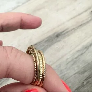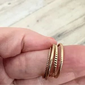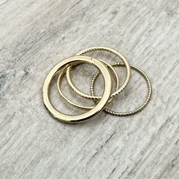 Gold Stackable Rings. Size 7 1/2. Enhance your style with this elegant gold-tone stacking ring set. Set of 4. Wear all together or alone. Perfect for any occasion, these rings add a touch of sophistication to your look. Pre loved, barely worn. Excellent condition.