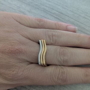 Elegant stacked rings in yellow gold, rose gold and white gold. each has a stamp of 750 indicating they are 18-karat gold. Unique design for a modern look.