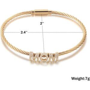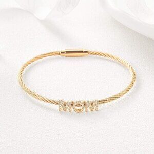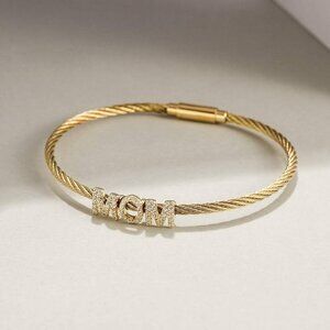 Gold Stainless Steel Cable Wire Bangle for Women with Cubic Zirconia — Stylish mom gift with a timeless twist.