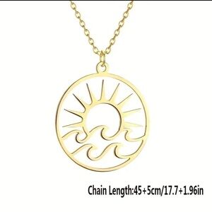 Gold Stainless Steel Sun Wave Pendant Necklace. Chain measures 17.7in + 1.96in with pendant.