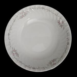 Vintage Gold Standard Genuine Porcelain China round serving bowl, made in Japan. Features a gently scalloped swirl rim adorned with delicate pink rose clusters and soft gray scrollwork around the edge. A refined and timeless addition to any table, ideal for serving vegetables, salads, or side dishes.