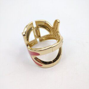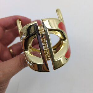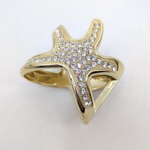 Gold-tone hinged cuff bracelet in a bold starfish design. One side features glossy coral-red enamel, the other is set with sparkling clear rhinestones. Secure spring hinge closure. Lightweight statement piece perfect for coastal glam, resort, or summer styling.