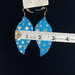 Gold Stars Turquoise Blue Leather Feather Earrings 3.5 Inches