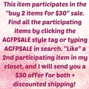 💖 BUNDLE THIS ITEM WITH ANOTHER 2/$30 ITEM IN MY CLOSET, AND I WILL SEND YOU A $30 OFFER ON BOTH! There are hundreds of participating items to choose from. To find these items, type AGFPSALE in the search bar on Poshmark or click the AGFPSALE style tag on this listing!
