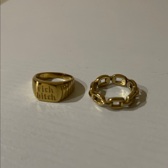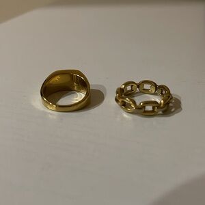 Set of two gold rings. One features a bold statement engraving. The other has a chain link design. Size 7.5