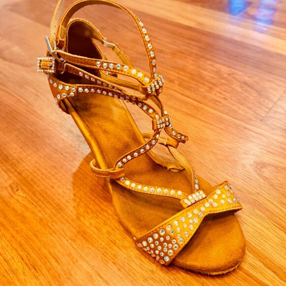 Strappy gold heels with ankle strap and adjustable straps. Suede bottoms in good condition-- only worn dancing 3 times. women's US Size 7-7.5