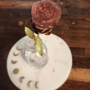 Elegant rose quartz flower with gold leaves. Perfect for home decor!