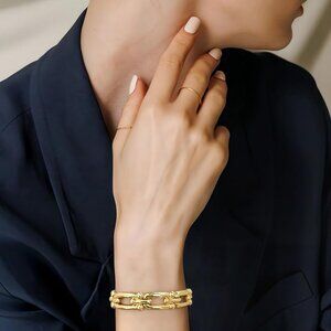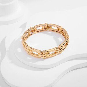 Features: These wide elastic bangles feature a stylish U link chain design with polished gold plating. The stretchable elastic makes them super comfortable and adjusts to fit most wrists effortlessly. Perfect for dressing up or everyday sparkle.