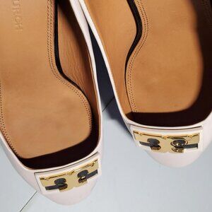 These heels have pleather top but leather sole - the toe/pad part of the sole/tread is covered and is slick - obviously very bad Tory Burch fakes (i never found a pair of Tory Burch heels online that even look like these-never found a size 10C by her either....) -BUT great if you are looking for heels like your fourth grade teacher used to wear (must be over 40 to understand) AND your first name starts with 'T'(or last name) or you love a T- I like the block heel is lined with gold metallic on inside heel - and these heels are pretty substantial at 1lb 11ozs - see all pics for measurements and condition - the pleather does have some scratches and blue circle shows some red ink stain - tread in excellent condition - inside heel clean with no toe marks