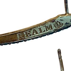 These elegant gold and teal drop earrings by Realm add a touch of sophistication to any ensemble. Embellished with shimmering crystals, they provide a stylish accent that is both eye-catching and refined. Designed with a sleek curve, these earrings seamlessly blend modern aesthetics with timeless elegance.