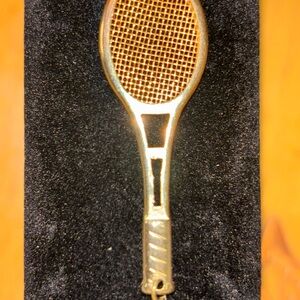 Elegant gold tennis racket pendant. Perfect for sports enthusiasts.