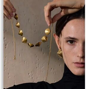 This elegant gold jewelry set includes a bold statement necklace and matching earrings crafted from durable stainless steel and finished with real PVD gold plating. With a sophisticated matte texture and sculptural design, this set is perfect for special occasions or dressing up your everyday look.