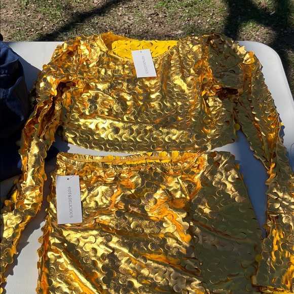 Shiny gold two-piece set with textured design. Includes long-sleeve top and matching skirt.