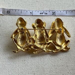 Add a touch of whimsy to your collection with this vintage gold-tone brooch featuring the iconic Three Wise Monkeys. Each playful monkey is sitting cross-legged, representing “See No Evil, Hear No Evil, Speak No Evil.”
