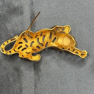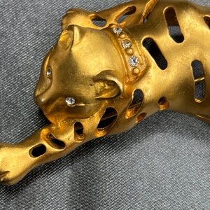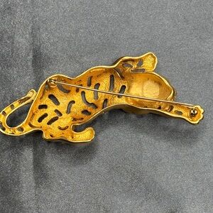 Elegant gold tiger brooch with intricate cut-out design. Perfect for adding a touch of luxury to any outfit.