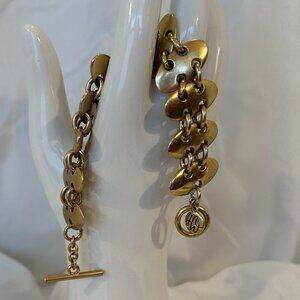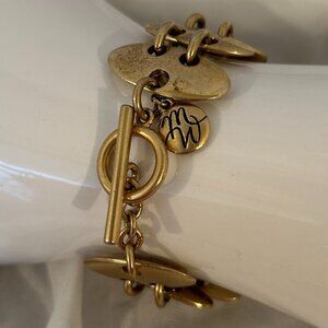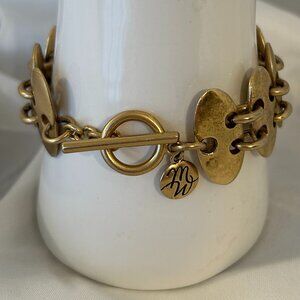 This mid-century heavy gold Bracelet has the maker's tag "MW" in script attached near the toggle closure. The gold plated bracelet measures 7" in length, has been gently worn and is in good vintage condition. I will deliver this unisex bracelet in a gift box.