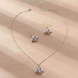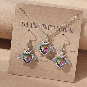 Gold Tone 3 Pcs Rhinestone Heart & Angel Wings Necklace & Earring Set