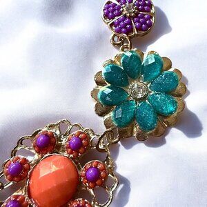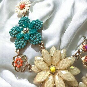 FEATURES: Statement Necklace featuring assorted 3D sculpted flowers. Each flower has textured, curved petals iridescent AB (aurora borealis) rhinestones / gold tone link chain and extender