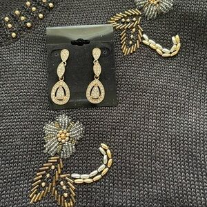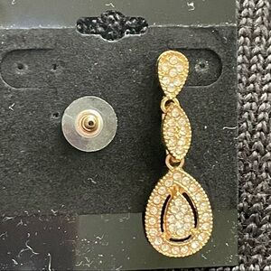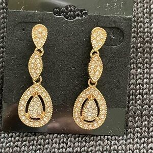 Gold tone and white crystal pear shaped drop earrings. Approximately 1 3/4” long and 1/2” wide. Beautiful dangling earrings. Stunning sexy sparkling statement earrings. No missing crystals.