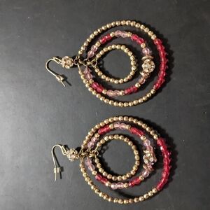 Gold Tone Beaded Pink Crystal Rhinestone Dangle Hoop Statement Earrings.