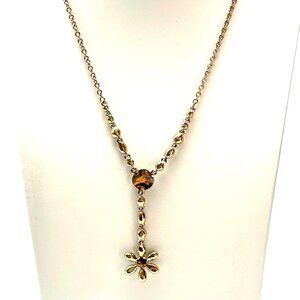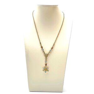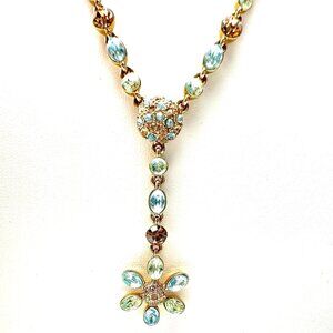 Gold Tone Bezel Set Crystal Y Drop Flower Pendant — Blue Green Stones 16-18" EUC
