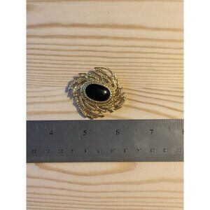 Elegant gold tone brooch featuring a black cabochon in an open filigree setting. This oval-shaped pin is perfect for adding vintage charm to any outfit, suitable for various occasions. Ideal gift for women who appreciate timeless accessories.
