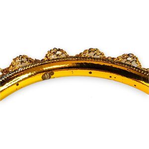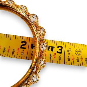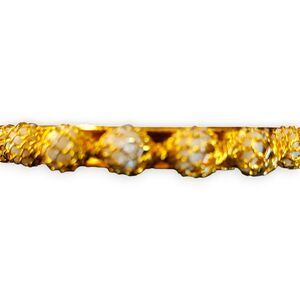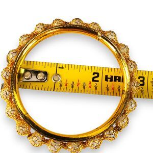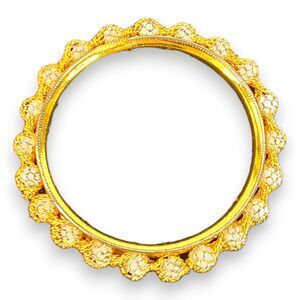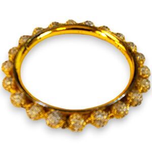 Elevate your wristwear with this exquisite gold-tone bangle, richly adorned with white beads secured by an intricate basket weave design. The bracelet's just over 2" interior diameter ensures a snug and comfortable fit. Its sparkling appearance and craftsmanship hint at an Indian-style influence, making it a standout piece. It is in very good condition, with meticulous detailing that captures the essence of luxury and elegance. Ideal for those who appreciate global-inspired jewelry.