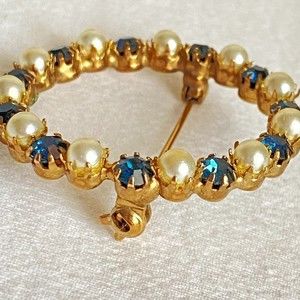 Gold Tone Brooch Faux Pearl And Blue Stone Circle Open Work