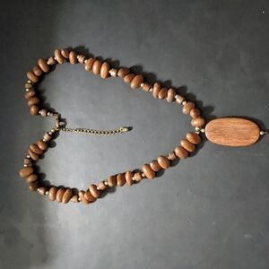 Gold Tone Brown Wooden Beaded Statement Pendant Necklace. 20"-23" long.