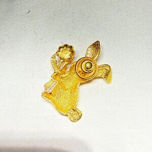 This charming gold tone lapel pin features an adorable bunny rabbit holding a flower, perfect for Easter or springtime flair. The vintage-style brooch adds a whimsical touch to jackets, bags, or hats. Made from durable metal with textured detailing and a secure clasp back, this pin is a delightful gift for collectors or animal lovers alike.