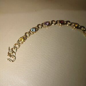 Gold Tone Chain Bracelet Heart-Shaped Multi-Colored Gemstones Toggle Clasp