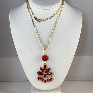 Gold Tone Chain Necklace With Red Crystals And Red Bead Pendant.