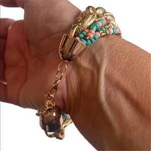 Gold tone chain with beaded bracelets twisted as one bracelet. Turquoise, cream, peach and gold tone. Adjustable chain with lobster claw clasp. NWOT!