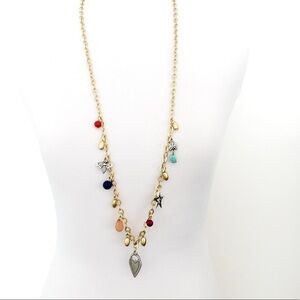 Chico's Layer Necklace. Multiple pendant charms: silver heart, silver star, lady bug, bee, and glass, metallic and stone