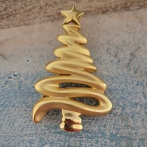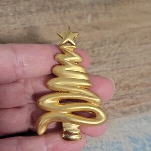 Elegant gold tone Christmas tree brooch with a star on top. Perfect for holiday outfits. No markings I can find