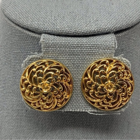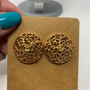 Gold Tone Circle Dome Floral Swirl Large Stud Earrings