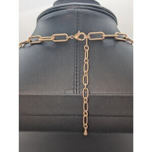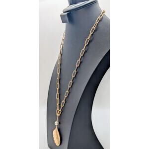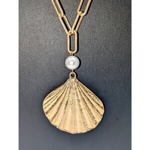 Gold Tone Clam Shell Faux Pearl Paper Clip Long Chain 28.25"-31.25" Necklace. Not a bright gold but a soft muted brushed gold look. Pre-owned, this necklace is in excellent condition and looks great layered with other pieces.