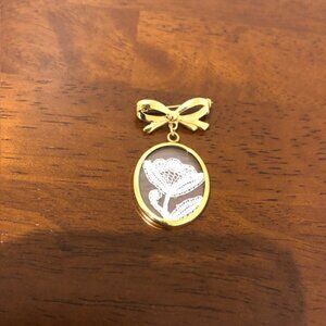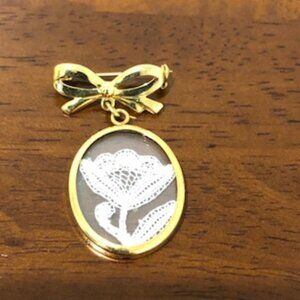 -This lovely brooch is gold tone, and it features a delicate white flower in the middle.