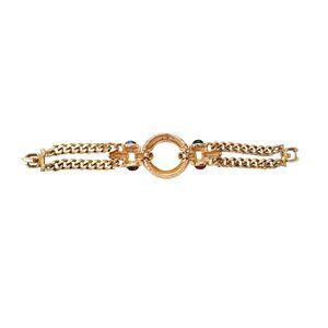 Complement your style with this classy Designer Style Gold Tone Bracelet and add an instant refined finish to your wardrobe. The serene beauty of the openwork ribbed rope circle centerpiece exquisitely combines with red, blue, green, and purple cabochons adorned with clear rhinestones. The dual chain showcases remarkable Designer elements with a fashionable twist, classically designed to captivate and charm. The bracelet band is crafted from a durable polished gold tone that will last and endure the test of time and wear. It has a substantial length of 8 inches which fits an average woman's wrists. The fold-over clasp closure is sturdy, ensuring firm attachment. The perfect accessory whether you're dressing up for a special event, adding a touch of elegance to your work attire, or enhancing your everyday look.